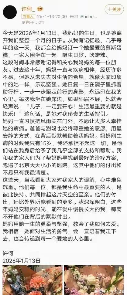 2026年1月13日,何晴离开刚好一个月。她的儿子许何,在这一天发了一篇长文。